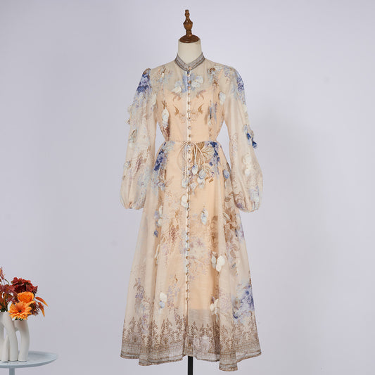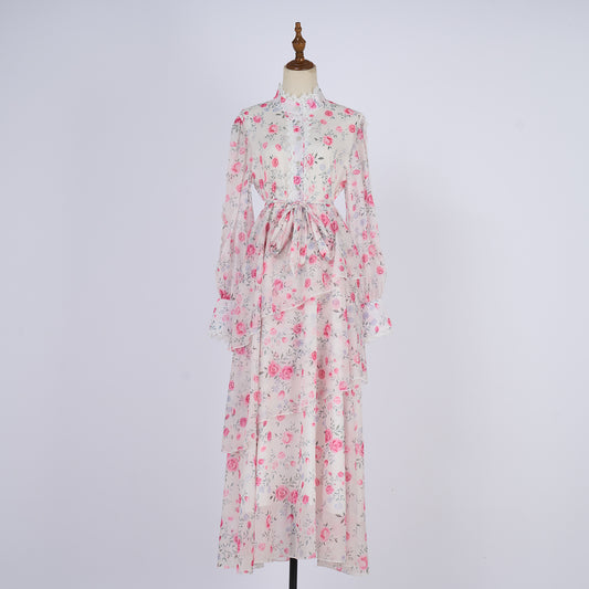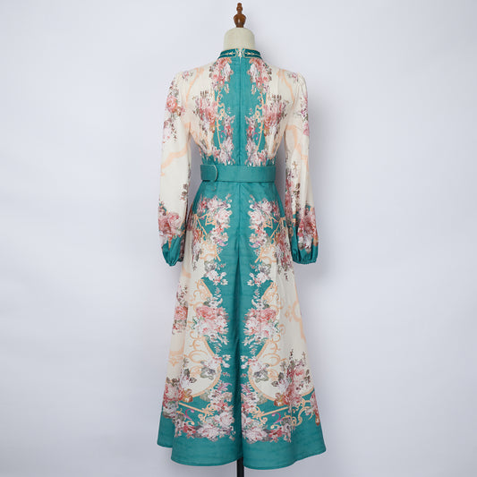 Long Sleeve Printed Buttons Of The Belt Dress