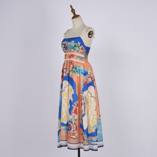 Linen Palm Tree Pattern Picnic Style Dress