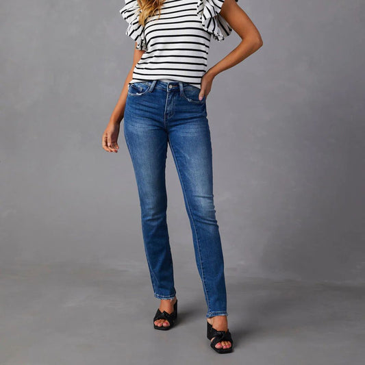 Washed out Elastic Mid Waist Straight Jeans