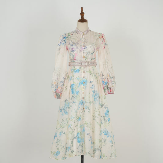 Graceful Stand-Up Collar Lantern Sleeve Dress w/ Belt